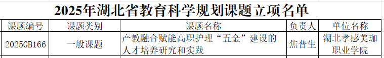 近日,湖北省教育厅公2025年度教育科研规划课题立项名单,我校医事科技学院焦普生老师《产教融合赋能高职护理“五金”建设的人才培养研究和实践》课题成功获批立项。