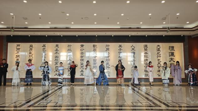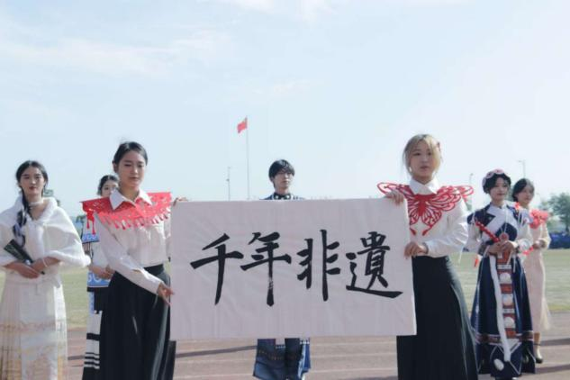 当学子们手持非遗展牌稳步前行,《青花瓷》的旋律与剪纸纹样、古典服饰交织,仿佛穿越千年时光,让现场观众沉浸式感受非遗文化的独特魅力。