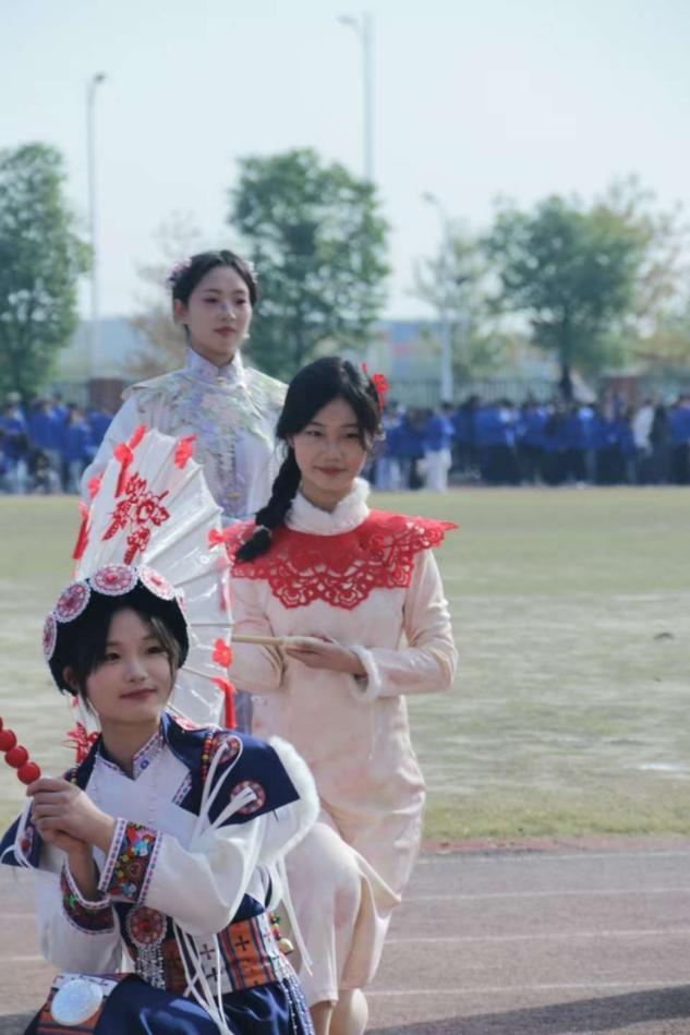 当《青花瓷》的旋律落下,学子们手持剪纸团扇与非遗展牌集体亮相,云肩轻扬、头饰闪耀,孝感雕花剪纸的灵秀与汉服的典雅在赛场上定格成最美的风景。这场走秀,不仅为运动会拉开了精彩序幕,更让青春力量与非遗魅力碰撞出耀眼火花,彰显了美珈职院在传统文化传承中的责任与担当。