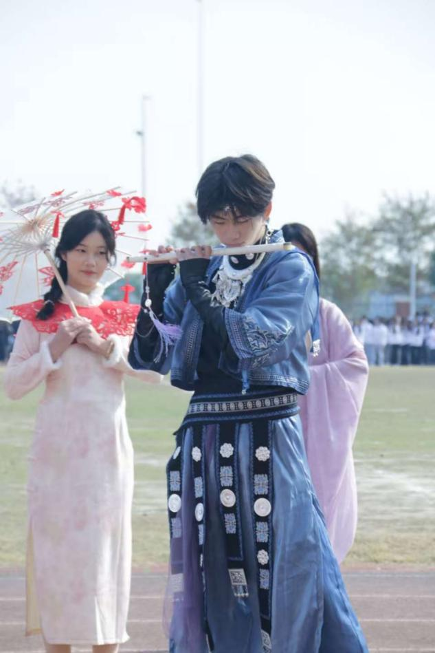 没有繁复的传统形制,却在简约的改良设计中藏着非遗巧思,当学子们手持非遗展牌稳步前行,《青花瓷》的旋律与剪纸纹样、国风服饰交织,让现场观众沉浸式感受非遗文化的现代魅力。