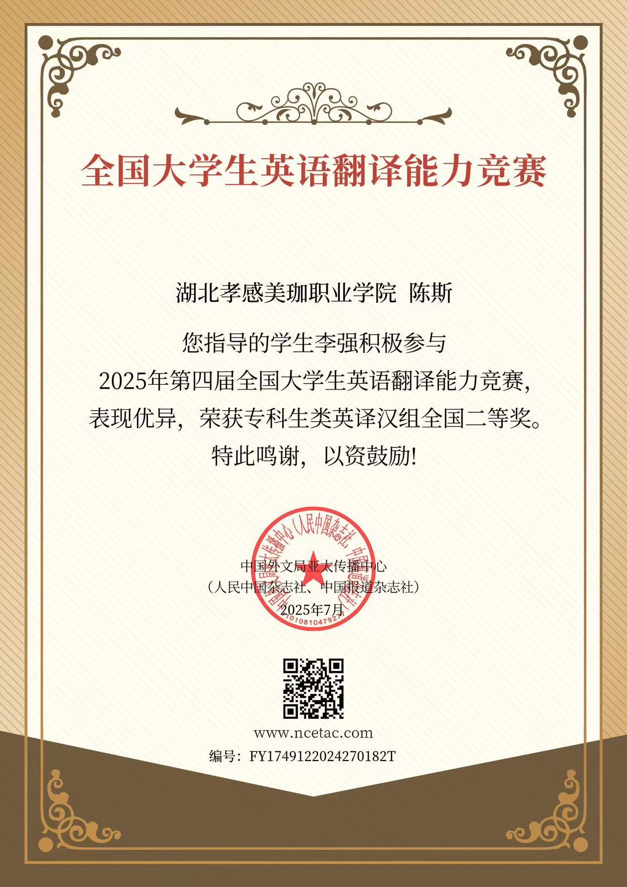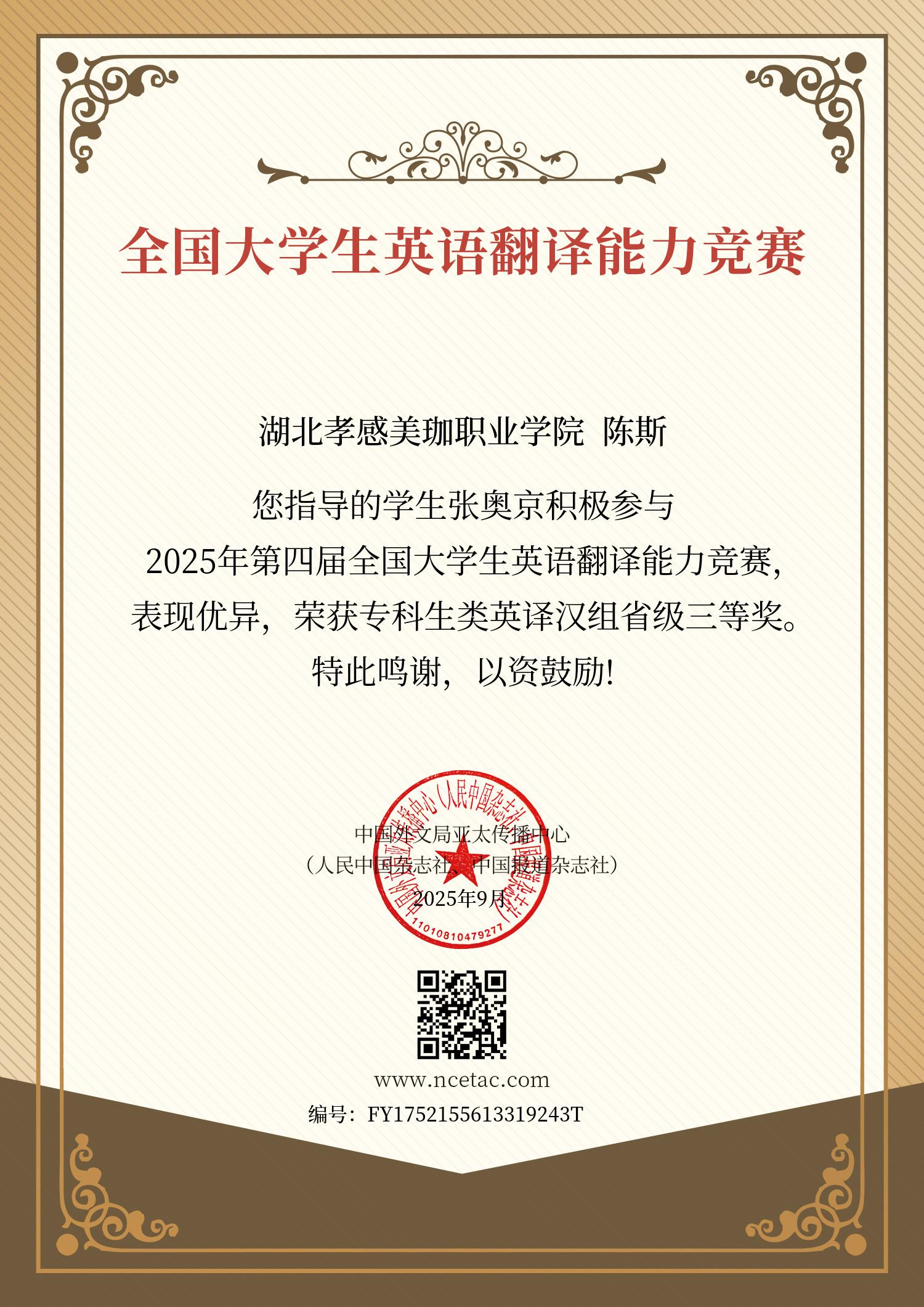 秉持学校“岗课赛融通”育人理念,陈老师化身学子英语竞赛路上的“筑梦人”,积极鼓励大家站上全国大学生翻译大赛、词汇大赛的舞台。她沉心钻研各赛事规则与评分维度,梳理竞赛核心考点与备赛技巧;课后化身专属指导师,逐字逐句点拨翻译文稿、系统梳理高频词汇,用耐心与专业为学生答疑解惑。 星光不负赶路人,在学子的勤勉奋进与陈老师的悉心护航下,这一学年硕果盈枝——大学生翻译大赛全国二等奖、省级一等奖、全国词汇大赛三等奖等荣誉接踵而至。看着学生们手捧沉甸甸的证书,脸上洋溢着自信与喜悦,陈老师满心欣慰。这份收获,既点燃了学子们的英语学习热情,更印证了“一分耕耘,一分收获”的成长真谛。