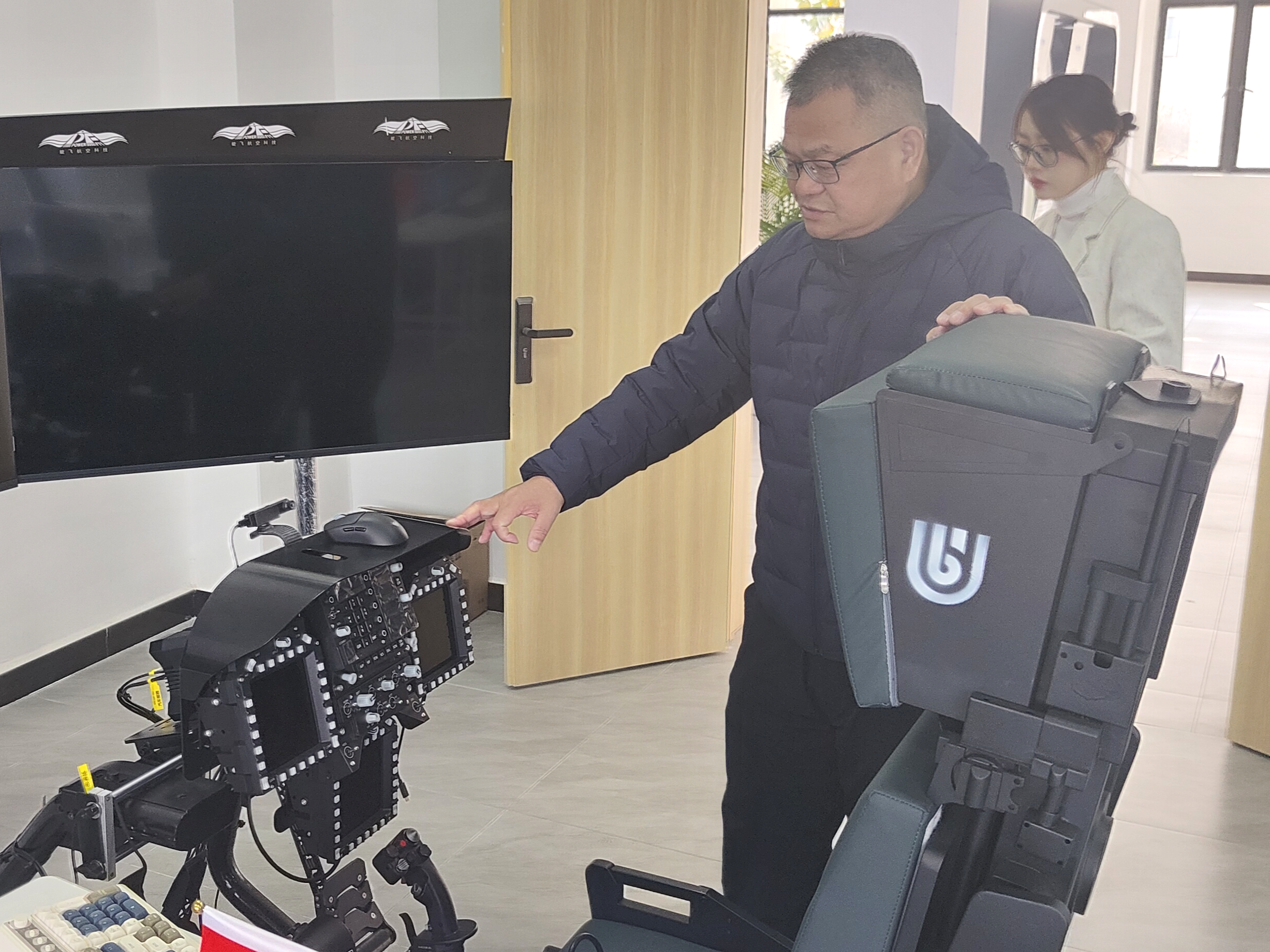 调研团队在能飞航空科技发展有限公司王总监的陪同下,深入企业运营与飞行基地一线。从展示企业发展历程的文化墙,到囊括各类工业级与特种无人机的综合展厅;从高仿真的固定翼飞机模拟操作器,到专业的检维修实训空间——团队系统考察了符合高职学生认知与技能成长的全链条教学场景。王总监详细介绍了无人机在智慧电力、智慧城市、智慧安防等十大领域的广泛应用,并展示了企业自主研发的带电绝缘涂覆无人机、喷火清障无人机、高压线除冰机器人等尖端产品,让调研组对行业前沿技术岗位和特种作业技能要求有了具象而深刻的认识。